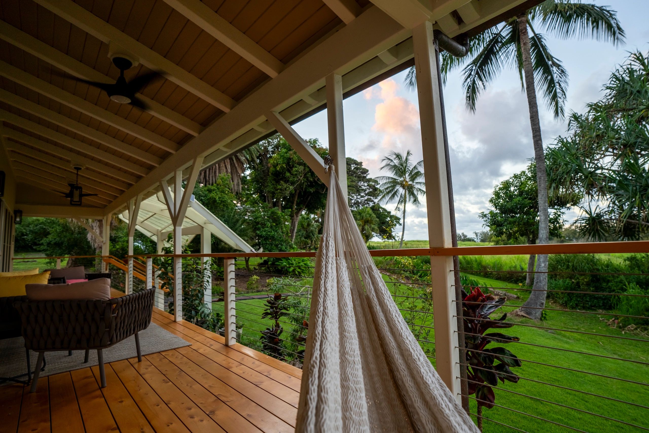 Our large lanais feature Restoration Hardware furniture and views of the ocean and Hawaiian countryside. Learn more about our grounds, which include large lawns, a 300-year old Banyan tree, hammocks, tree swings and tropical fruit trees.
